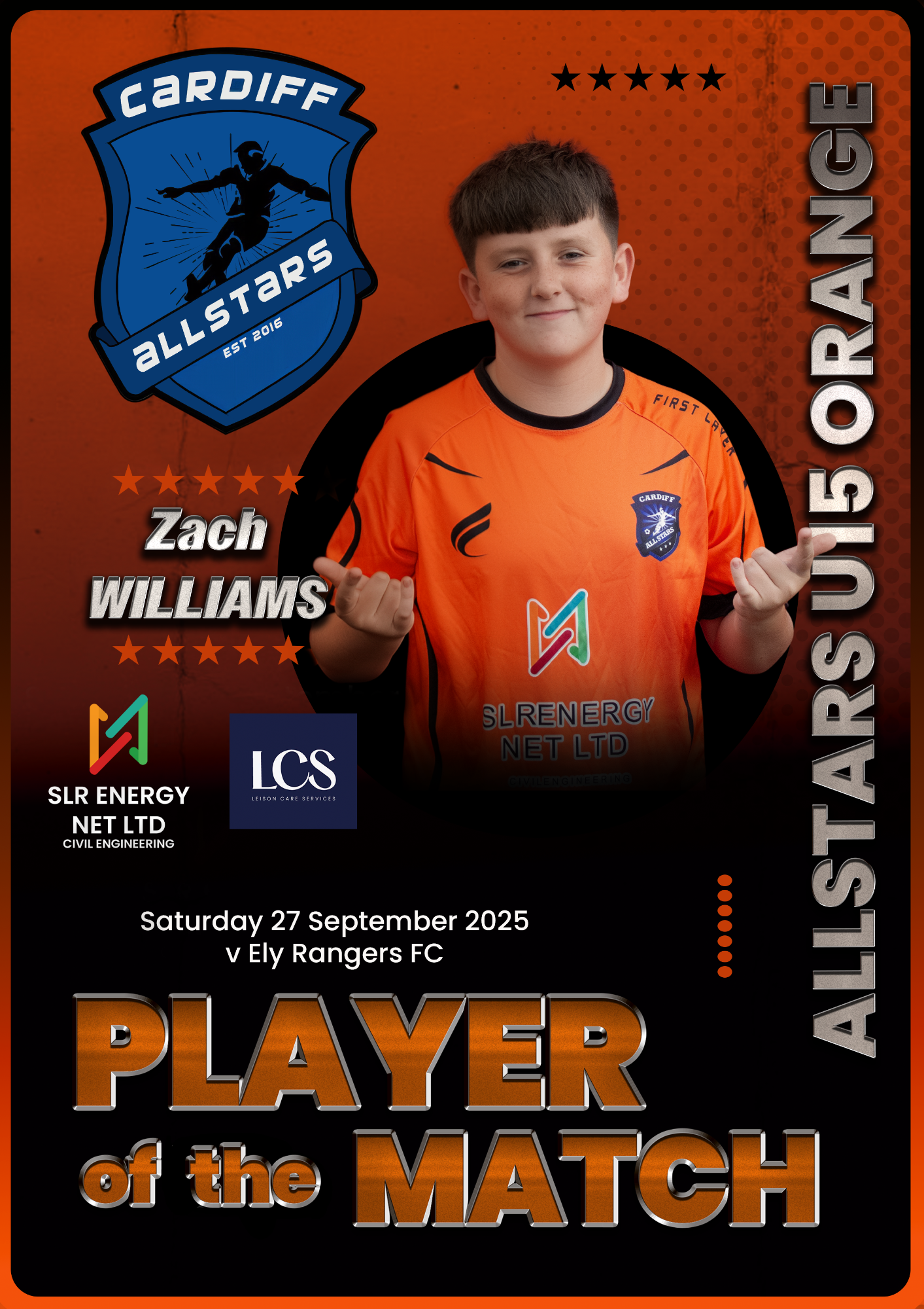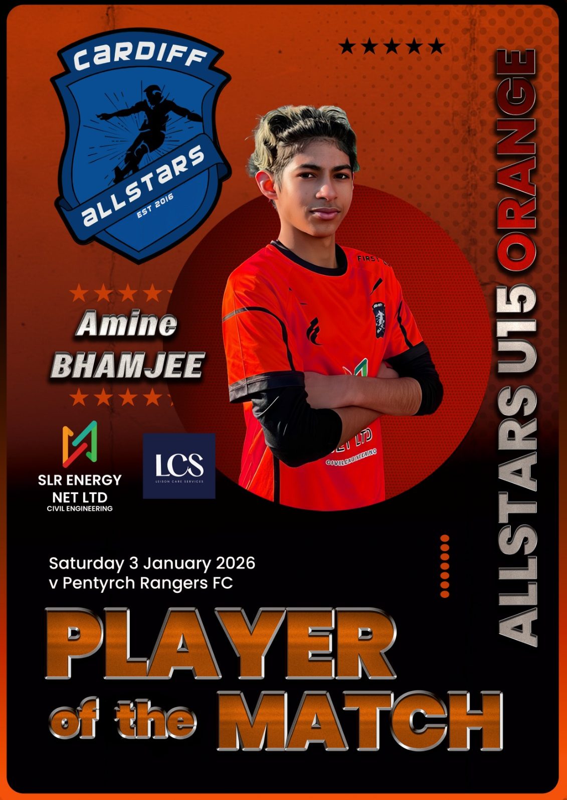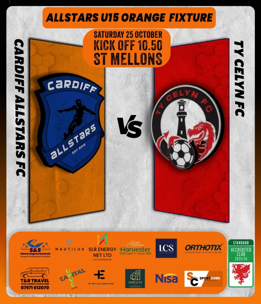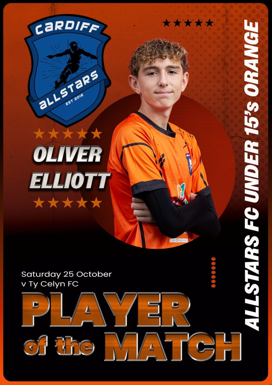 Cardiff Allstars Under 15’s Orange produced an impressive 6-0 win over Cardiff Cosmo’s FC Under 15’s.