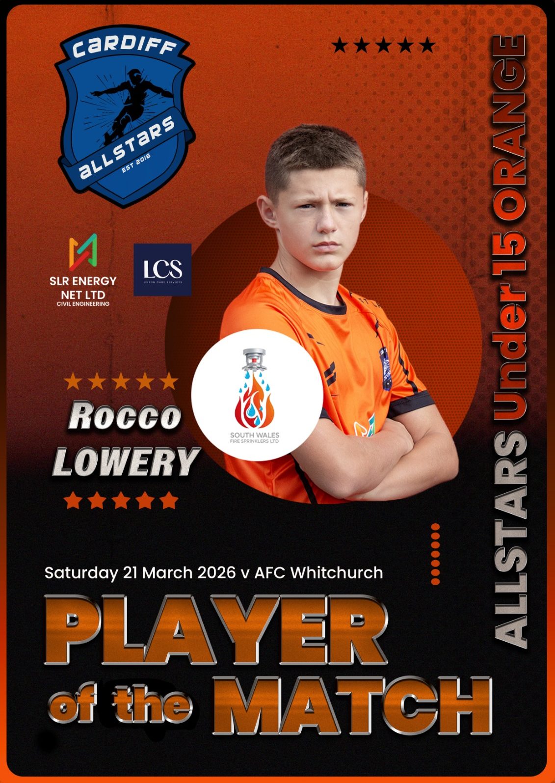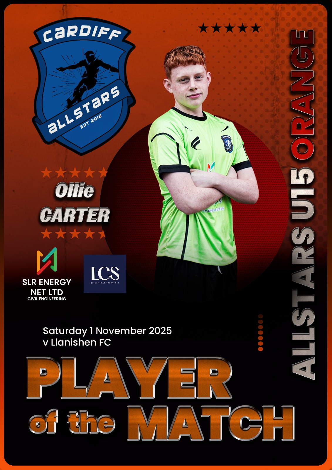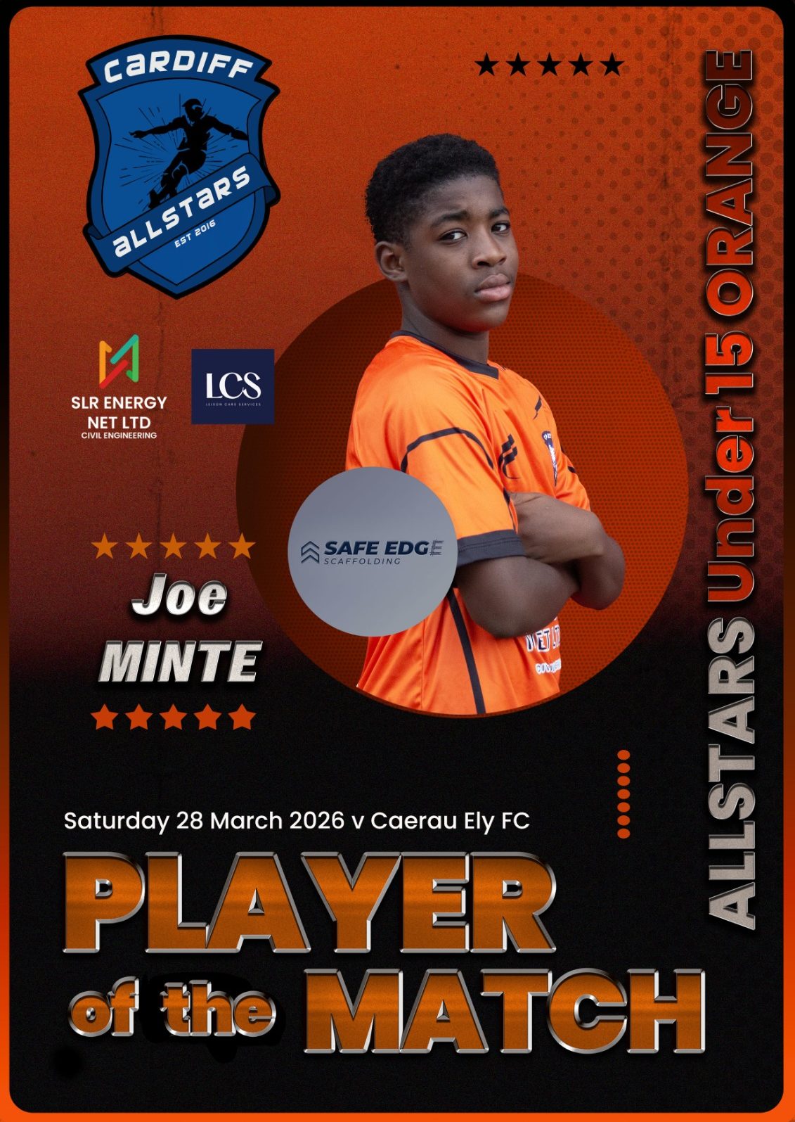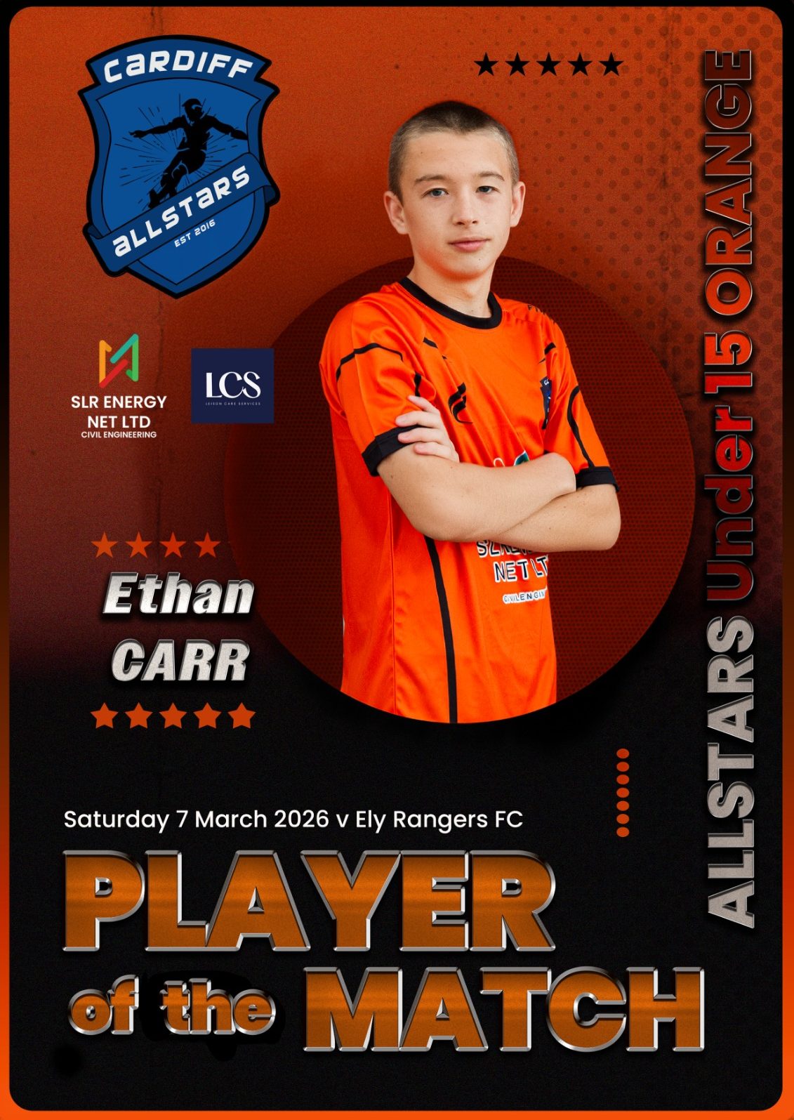 Cardiff Allstars Under 15’s Orange produced an impressive 6-0 win over Cardiff Cosmo’s FC Under 15’s.