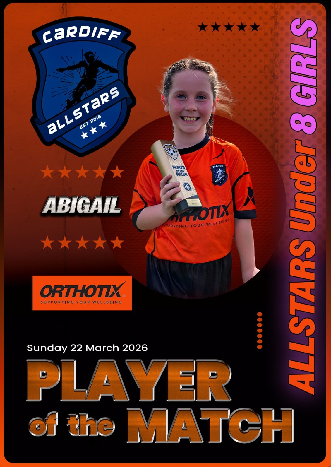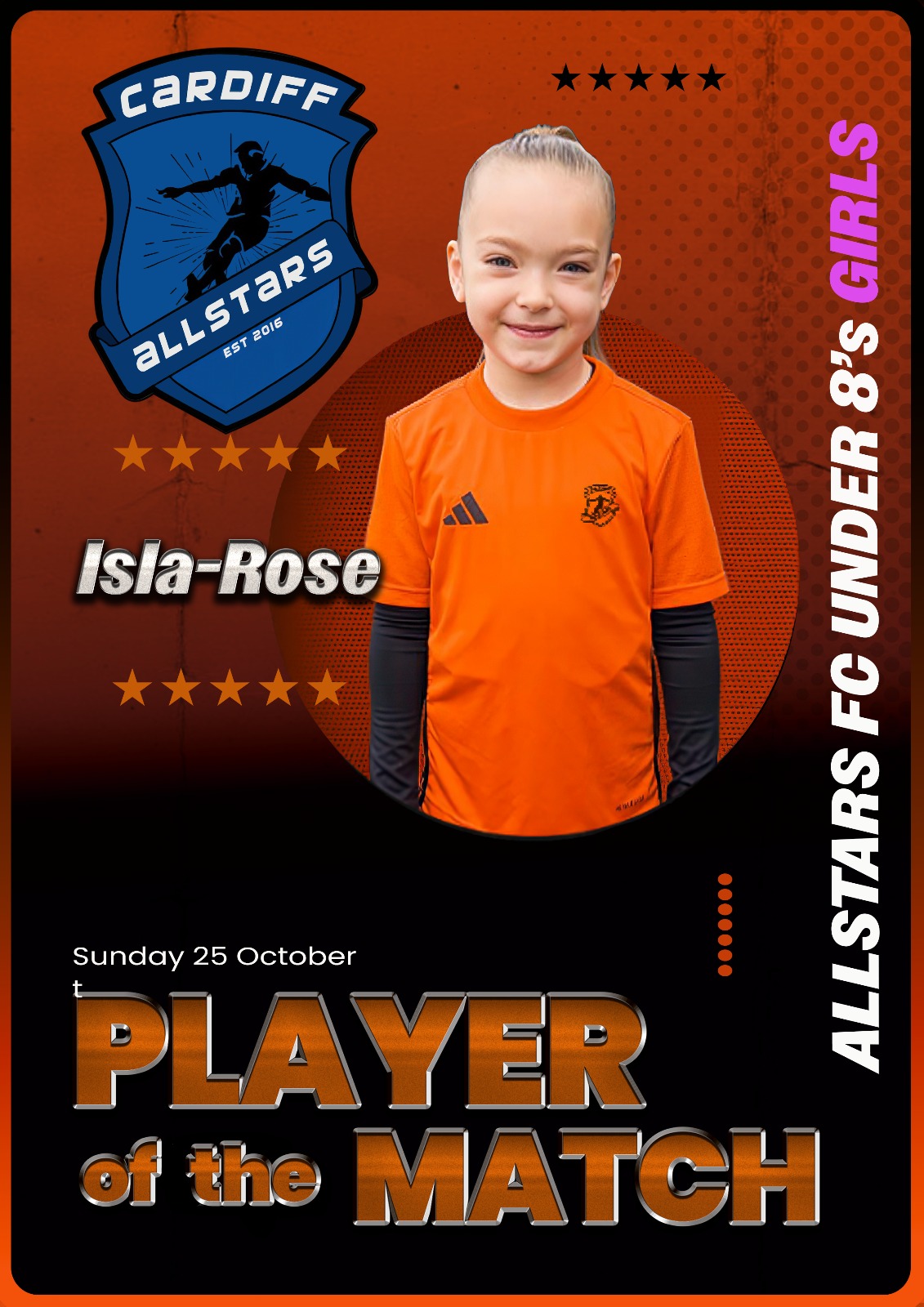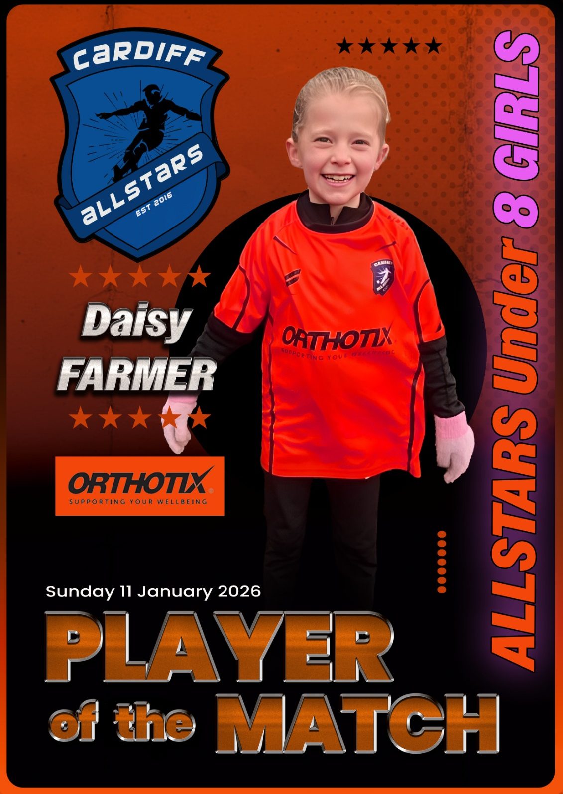 A big welcome to our newest Allstar, Abigail! What a debut — 110% effort from start to finish and even a goal to top it off. Brilliant work, Abi, and welcome to the Allstars family!